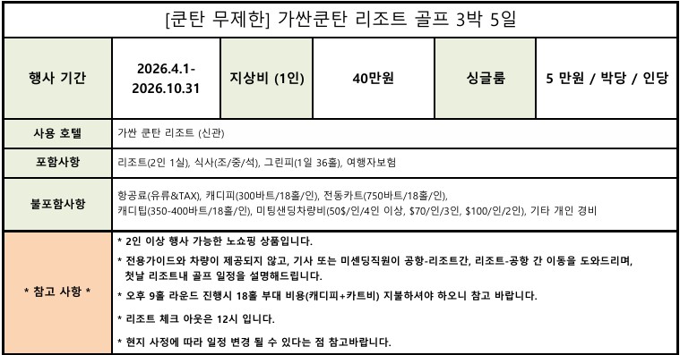 | 리조트 2인1실 조식 중식 석식 전 일정 그린피(1일 36H) 여행자보험 무료가입 |