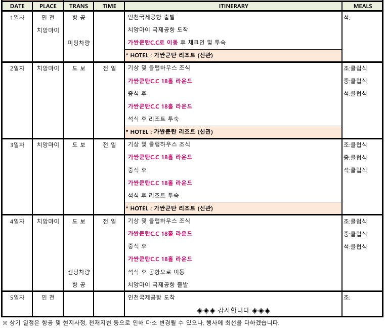 | 왕복항공권(유류+TAX) 캐디피 300바트-18H-1인 카트피 750바트-18H-1인 캐디팁 350-400바트-18H-1인 미팅샌딩비 $50-1인-4인기준요금 |