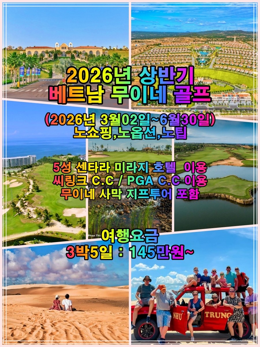 | 왕복항공권(유류+TAX) 호텔 2인1실 조식 기사+전용차량 전 일정 그린피 전 일정 카트피 전 일정 캐디피 무이네사막 지프투어 여행자보험 무료가입 |