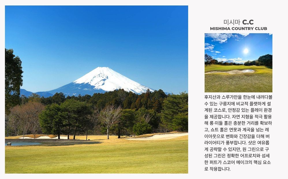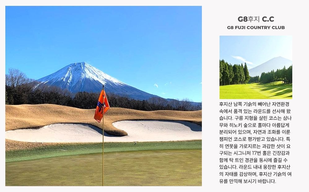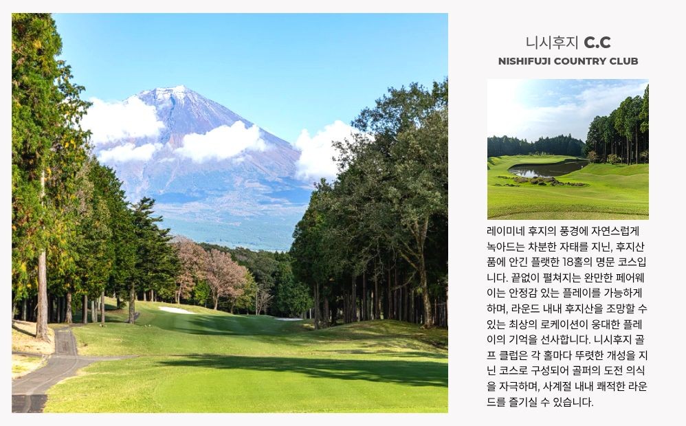 | - 니시후지C.C 1회 필수포함으로 진행됩니다. (추가비용 ZERO) - 체류일(2일차 3일차 등) 1부(08~09시대 티타임) 마감시 > 부득이 12시대 2부 쓰루플레이로 부킹 될 수 있습니다. |