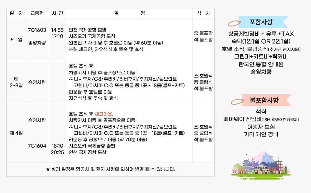 | 제주항공(수하물20kg,기내10kg) 7C1603편 인천 - 시즈오카 14:55 출발 - 17:10 도착 7C1604편 시즈오카 - 인천 18:10 출발 - 20:25 도착 |