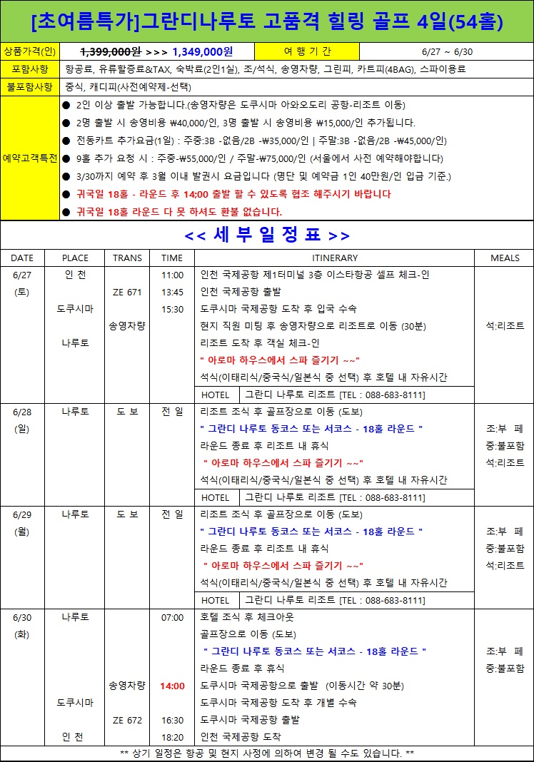 2인 이상 출발 가능합니다.(송영차량은 도쿠시마 아와오도리 공항-리조트 이동) 2명 출발 시 송영비용 \40,000/인, 3명 출발 시 송영비용 \15,000/인 추가됩니다. 전동카트 추가요금(1일) : 주중:3B -없음/2B -\35,000/인 | 주말:3B -없음/2B -\45,000/인) 9홀 추가 요청 시 : 주중-\55,000/인 / 주말-\75,000/인 (서울에서 사전 예약해야합니다) 3/30까지 예약 후 3월 이내 발권시 요금입니다 (명단 및 예약금 1인 40만원/인 입금 기준.) 귀국일 18홀 - 라운드 후 14;00 출발 할 수 있도록 협조 해주시기 바랍니다 귀국일 18홀 라운드 다 못 하셔도 환불 없습니다. |