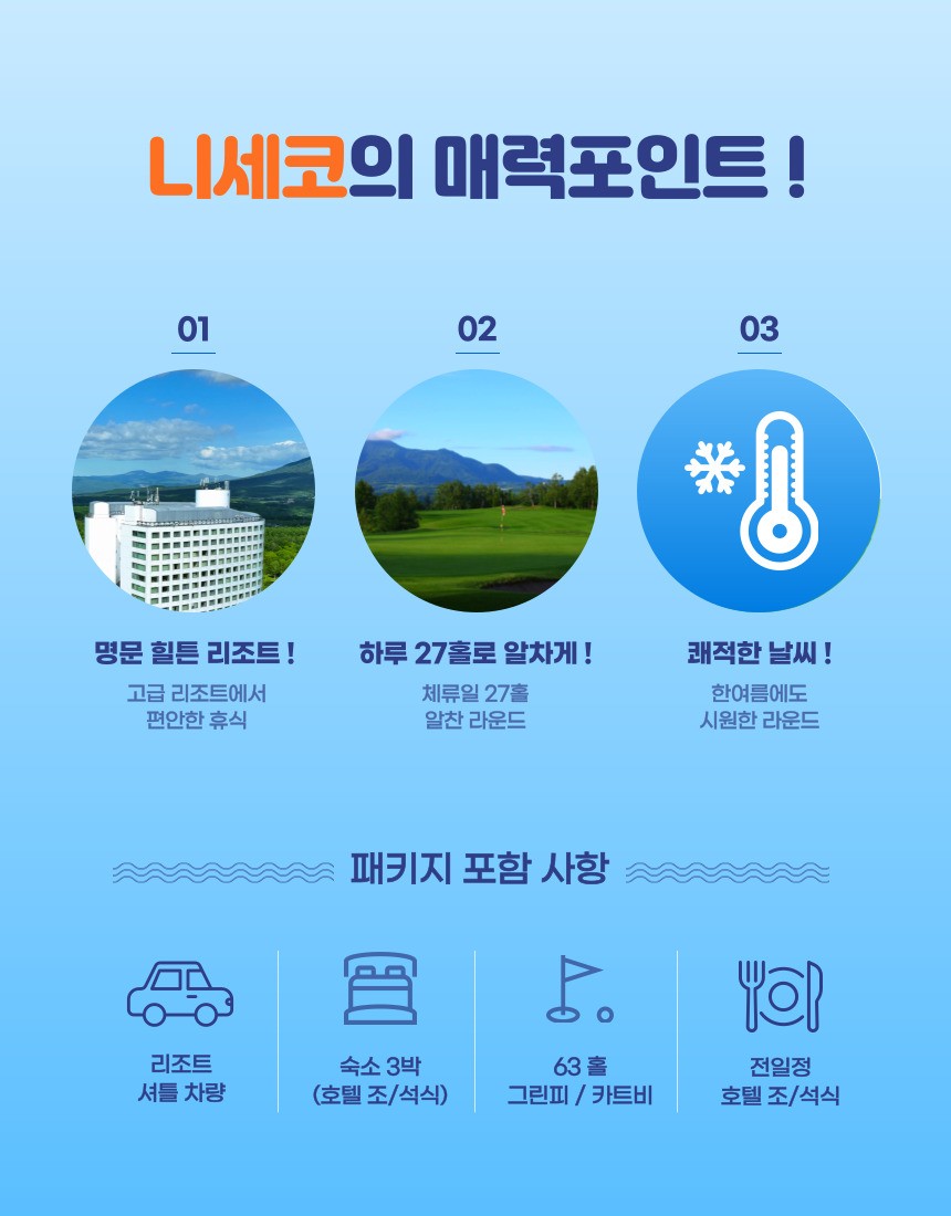 | 호텔 3박 호텔 조/석식 골프 63홀 (그린피, 카트비 / 셀프+카트 라운드) 리조트 셔틀 차량 골프 코스 라운드 시 중식 도시락 |