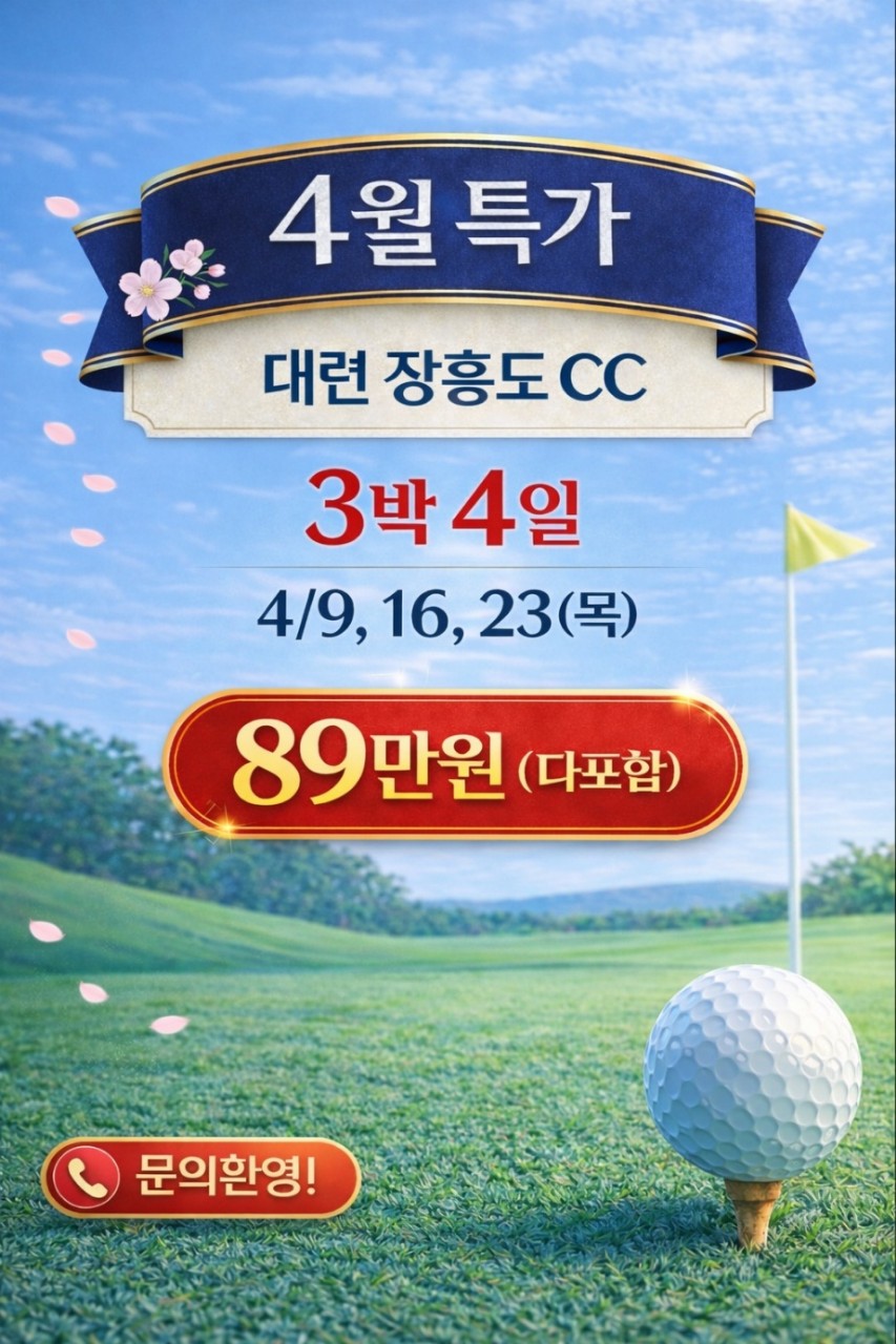 | 출발: 4/9(목)~4/12(일) 출발: 4/16(목)~4/19(일) 출발: 4/23(목)~4/26(일) 기간: 3박4일 골프: 18+27+27+0(72홀) 요금: 890,000원 |