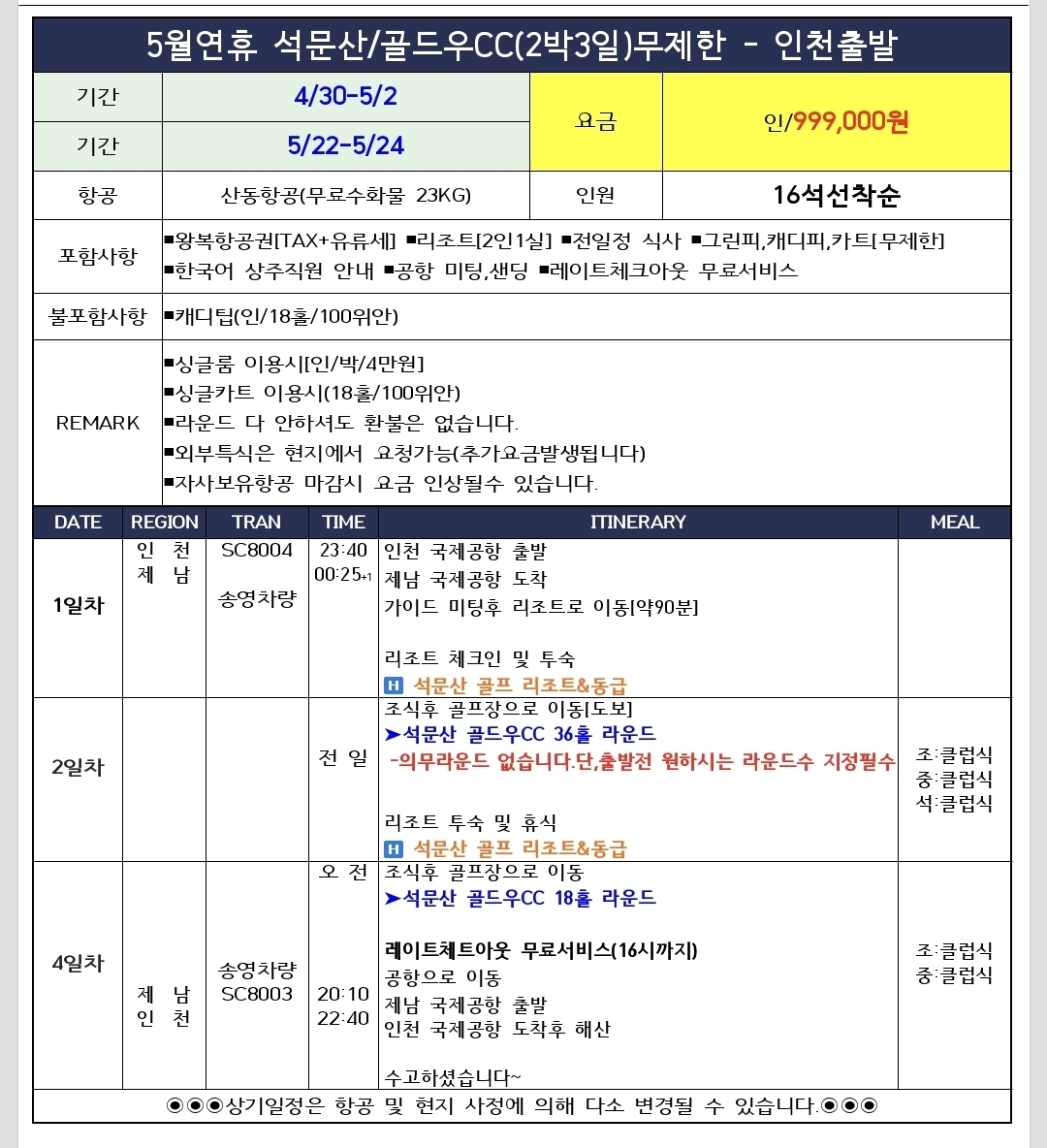 | 4/30(목) 출발 ▶ 999,000원 5/22(금) 출발 ▶ 999,000원 - 한정좌석 소진 시 마감입니다 |