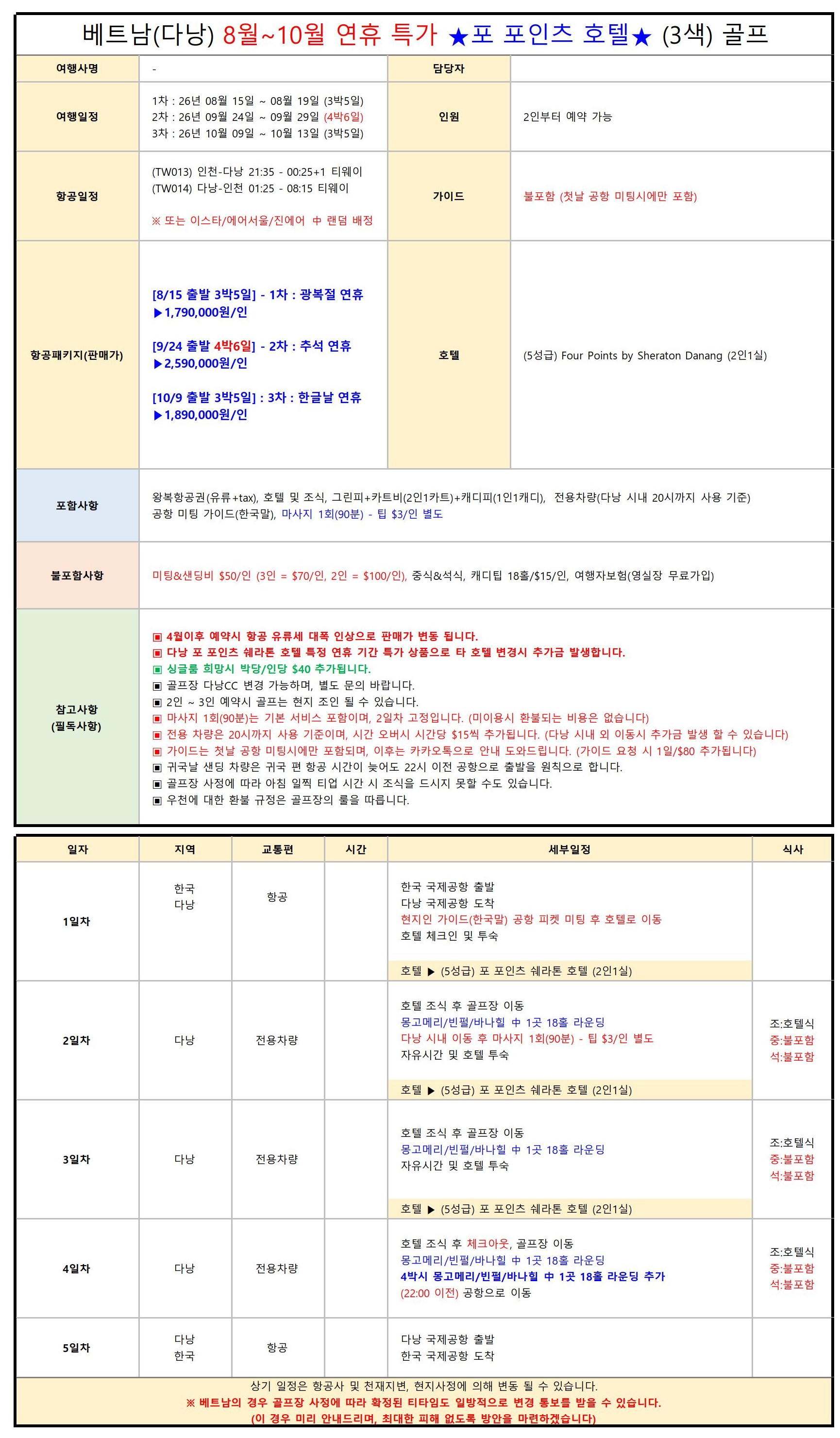 | - 타 호텔로 변경 불가한 상품입니다 - 마사지 1회 서비스는 2일차로 고정 - 가이드는 첫날 공항 미팅시에만 포함 - 미팅샌딩비 2인출발 $100 / 3인출발 $70 - 2~3인 예약시 골프는 현지에서 조인될 수 있음 - 귀국날 샌딩차량은 22시 이전 공항으로 출발원칙 - 우천에 대한 환불규정은 골프장 룰을 우선으로 함 - 전용차량 20시 초과시 시간당 $15 추가금 발생합니다 |
