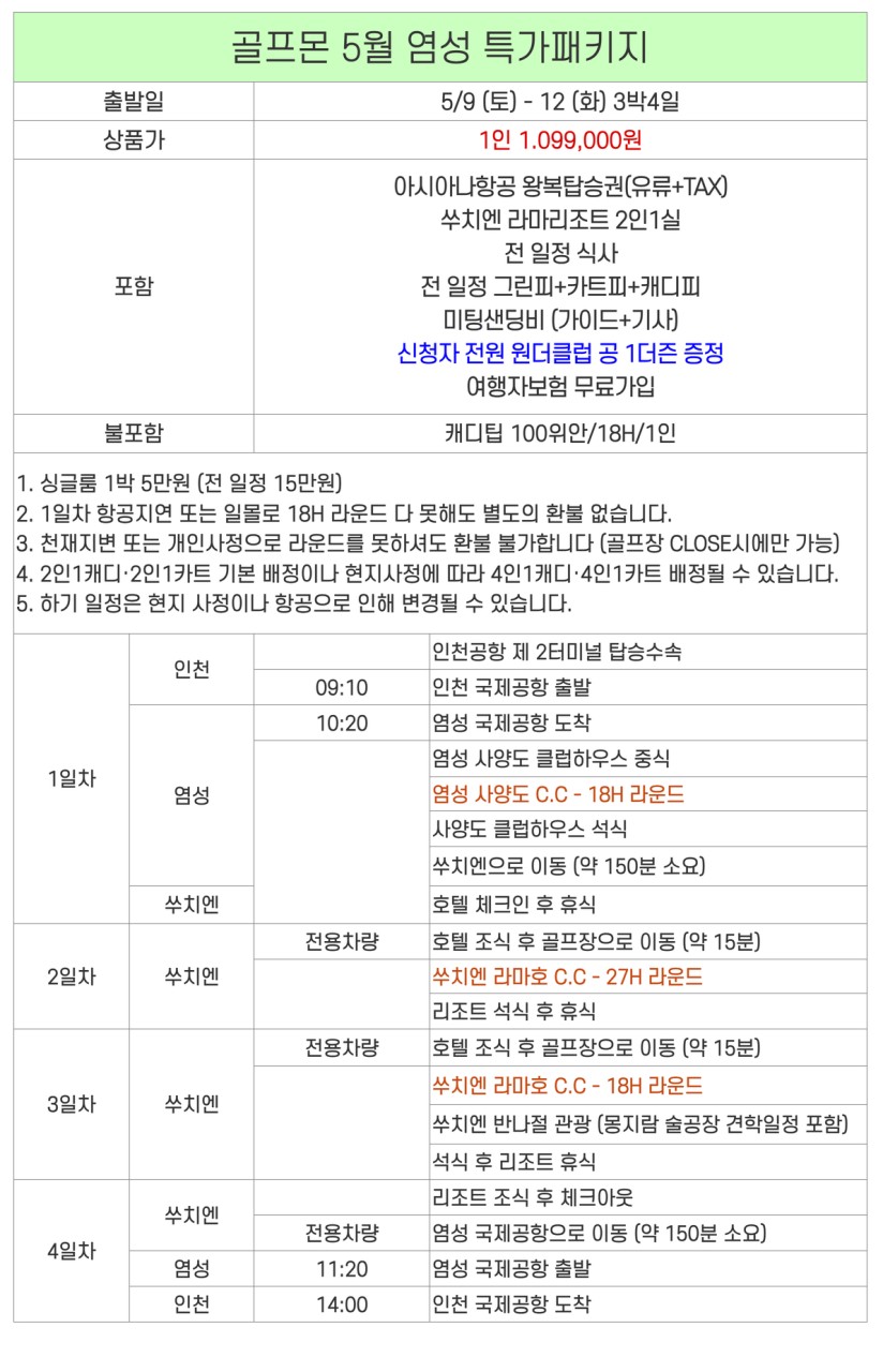 | - 싱글룸 1박 5만원 (전 일정 15만원/인당) - 골프장 CLOSE 선언 외 별도의 환불은 없습니다 - 현지 골프장 상황에 따라 2인1캐디 또는 4인1캐디 - 1일차 항공지연 및 일몰로 인한 미라운드 시 별도환불 불가 |