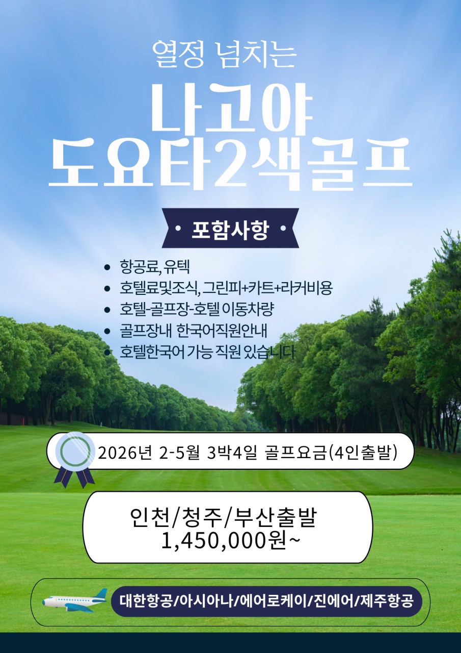 | 항공료.유류및텍스 - 실시간기준 메이테츠도요타호텔(4성-2인1실) 호텔조식 54홀 그린피 + 전동카트 + 라커비 점보택시(호텔-골프장-호텔) 한국어가능현지인안내(골프장내) 한국어가능 호텔직원근무 |