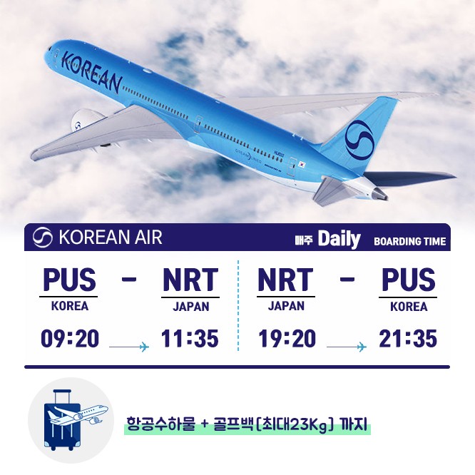 | 인천출발 대한항공(수하물23kg,기내10kg) 출발편 [KE703] 10:10 - 12:40 리턴편 [KE714] 20:55 - 23:25 부산출발 대한항공(수하물23kg,기내10kg) 출발편 [KE2129]09:20 - 11:35 리턴편 [KE2132]19:20 - 21:35 |