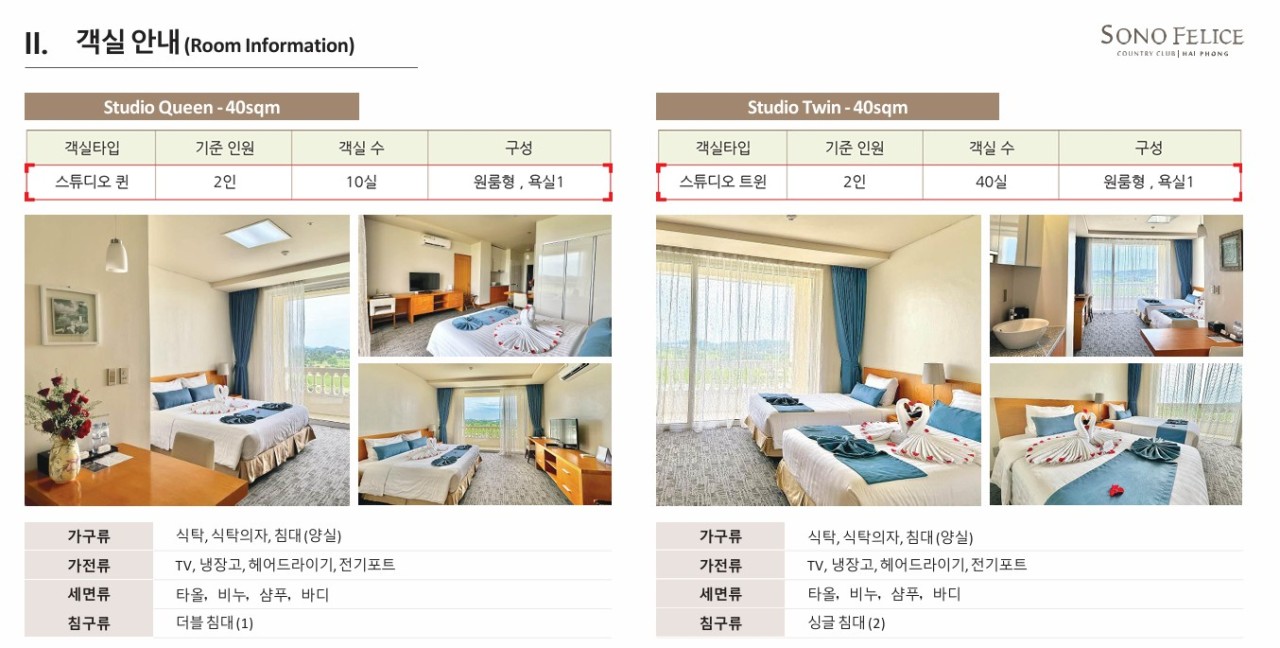 | - 2인도 추가요금 없이 동일 요금으로 진행 - 식사 및 캐디팁외 올포함 초특가 가성비 최고의 상품 - 항공 수화물 20kg제공 (골프백, 캐리어2개) - 11-3월 낮기온 20도내외 가을날씨,건기 라운드하기 좋은날씨 - 럭셔리 5성급 소노펠리체호텔, 상급골프장 소노펠리체cc 라운딩 - 인천 하이퐁, 4시간~4시간30분 - 하이퐁은 하노이, 호치민에 이어 베트남 3대도시 - 시내와 2~30분거리로 라운드후에도 마사지, 맛집, 쇼핑,야시장 - 하롱베이와 40분거리로 라운드후에도 하롱베이 크루즈관광 가능 - 프론트 한국어 가능 베트남직원 |