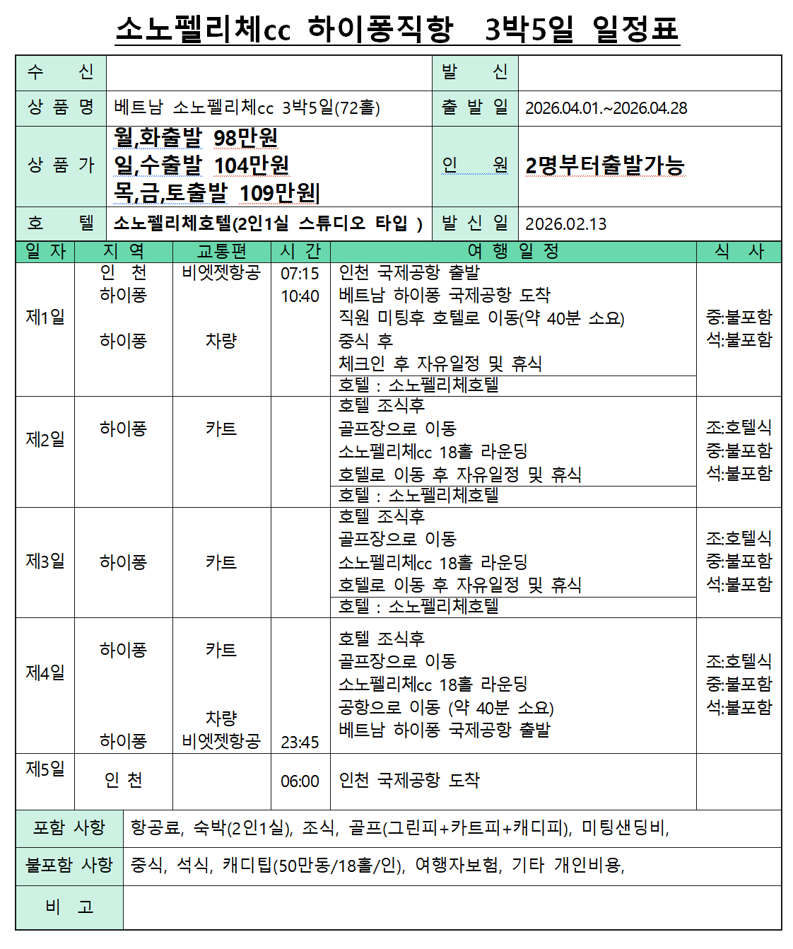 | 항공료 숙박(2인1실) 조식 골프(그린피+카트피+캐디피) 미팅샌딩비 여행자보험(서비스가입) |