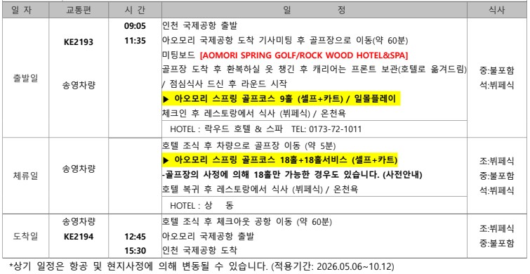 | 대한항공(수하물23kg,기내10kg) 출발편 (KE2193): 인천 09:05 → 아오모리 11:35 귀국편 (KE2194): 아오모리 12:45 → 인천 15:30 |