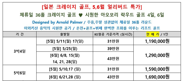 | - 특전: 5박 이상숙박시 석식 1회 무료 업그레이드 (4,400엔 상당) - 3인 플레이 추가금없음 - 2인플레이 주중없음 / 주말,일본연휴 1인 2,200엔추가 - 싱글룸 8,000엔/인/박 - 체류일 36홀은 대회 등에 의해 18홀만 가능한 경우도 있음 |